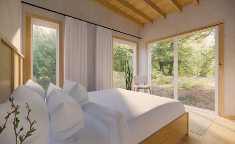 • The bedrooms are designed as comfortable retreats with space for full or queen beds and integrated storage solutions. Large windows bring in natural light while maintaining a calm and relaxing atmosphere.