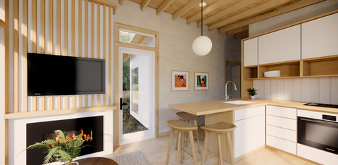 This modern modular home pairs Scandinavian inspired design with West Coast warmth, showcasing exposed timber beams, floor to ceiling windows, and seamless indoor-outdoor living. Thoughtfully designed with premium finishes and energy-efficient construction, it delivers luxury modular living in a refined, high-performance footprint.